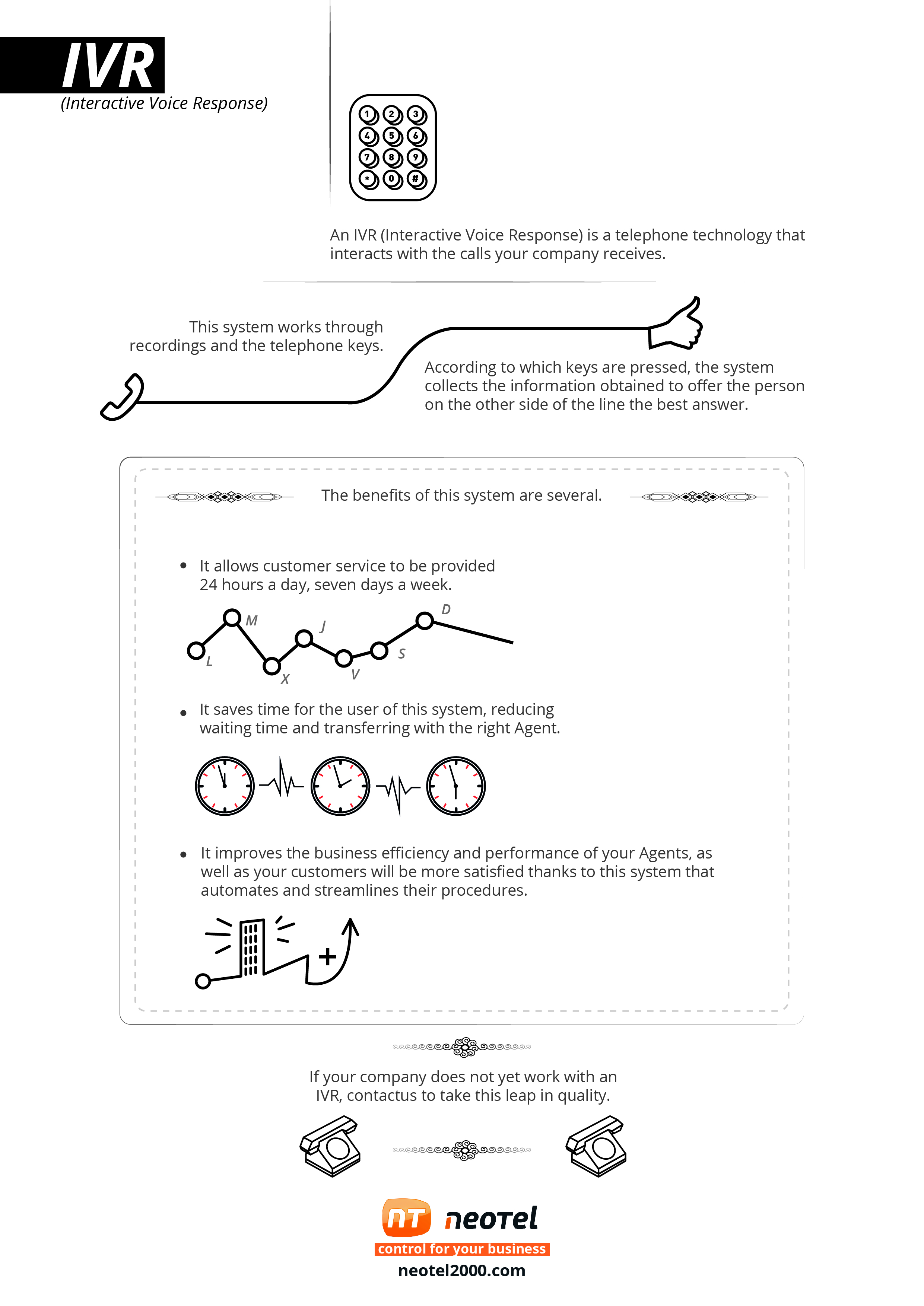 Interactive Voice Response or IVR is a Neotel functionality that allows you to play a voice message when your customers call your PBX, allowing them to address with the most appropriate extension for their communication need.