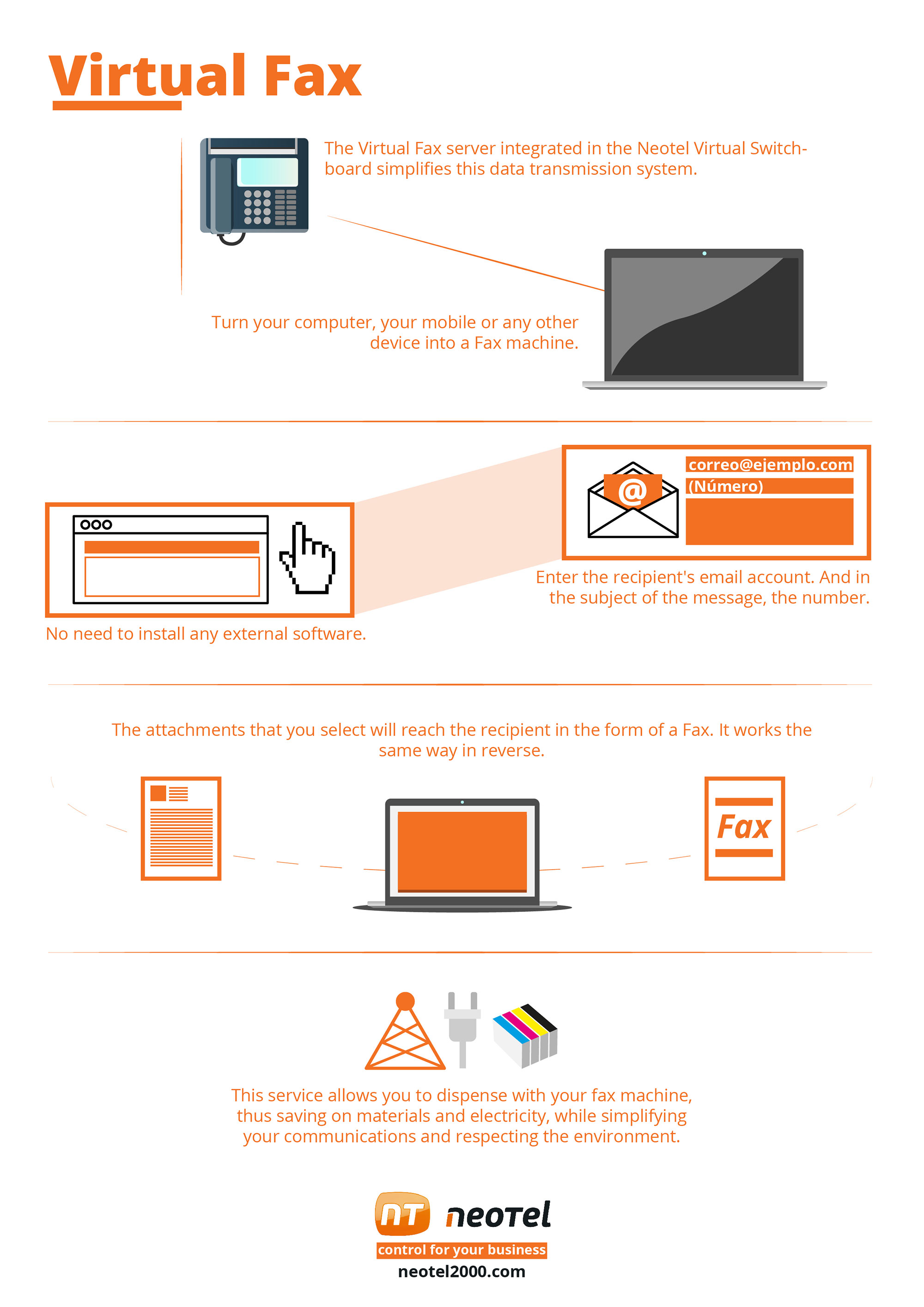 With Neotel’s brand new fax by email service, you could count on a complete, safe and high-quality service without the fax itself and its supplies, saving a considerable cost. All you need is this application and a terminal equipment (FWT) connected to Internet. It simplifies the procedure, saving time and getting more out of instant communications in your company.