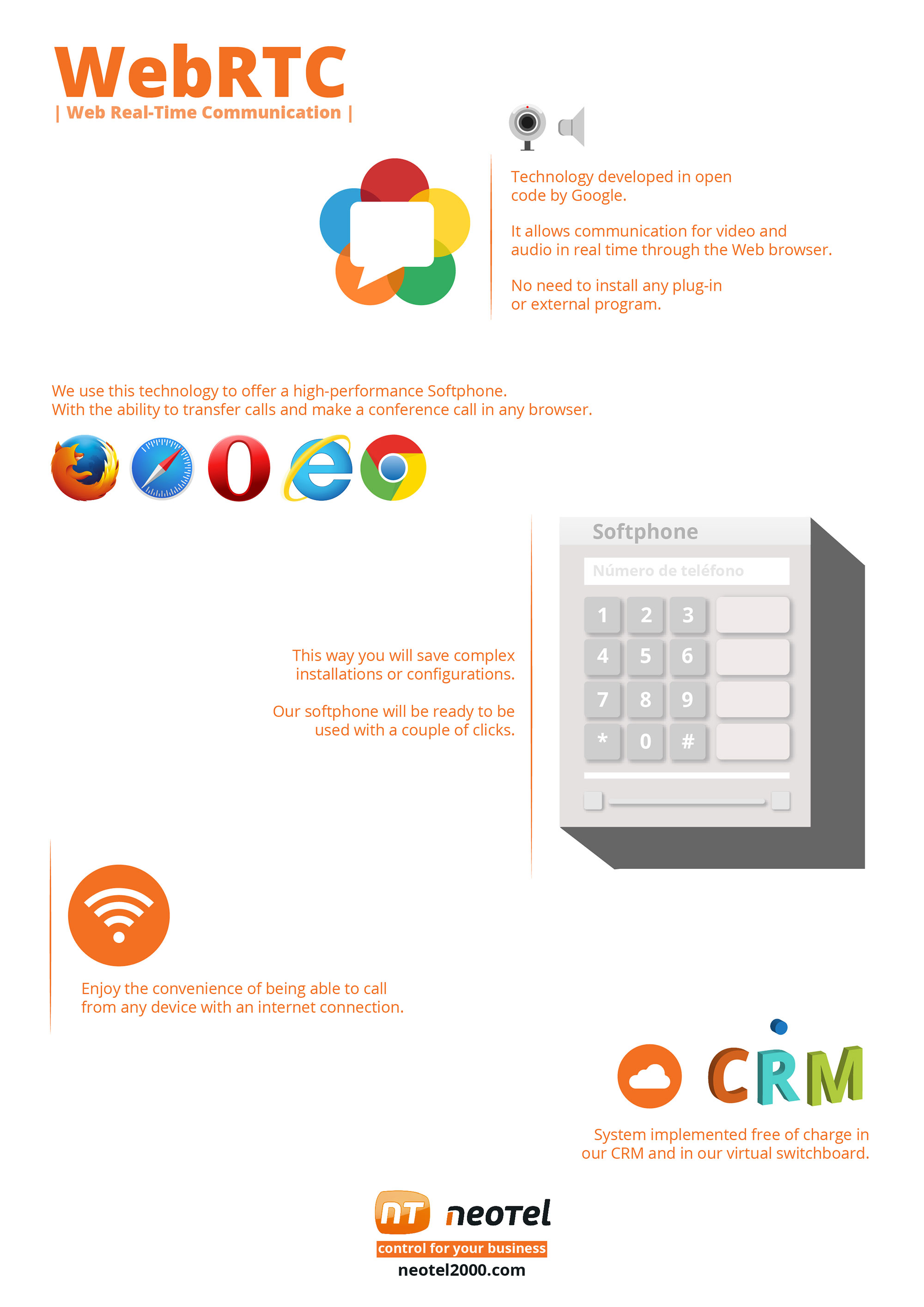 Get your WebRTC line and start making and receiving calls through your PC, mobile, tablet or Smart TV.